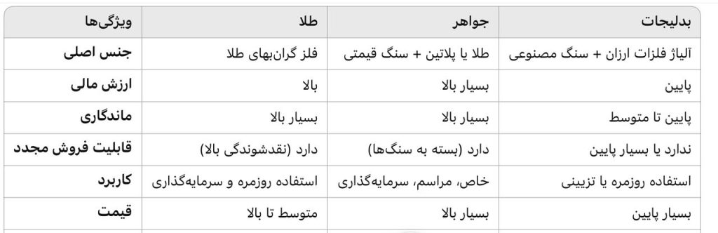 ۴. تفاوتهای کلیدی بین طلا، جواهرات و زیورآلات بدل